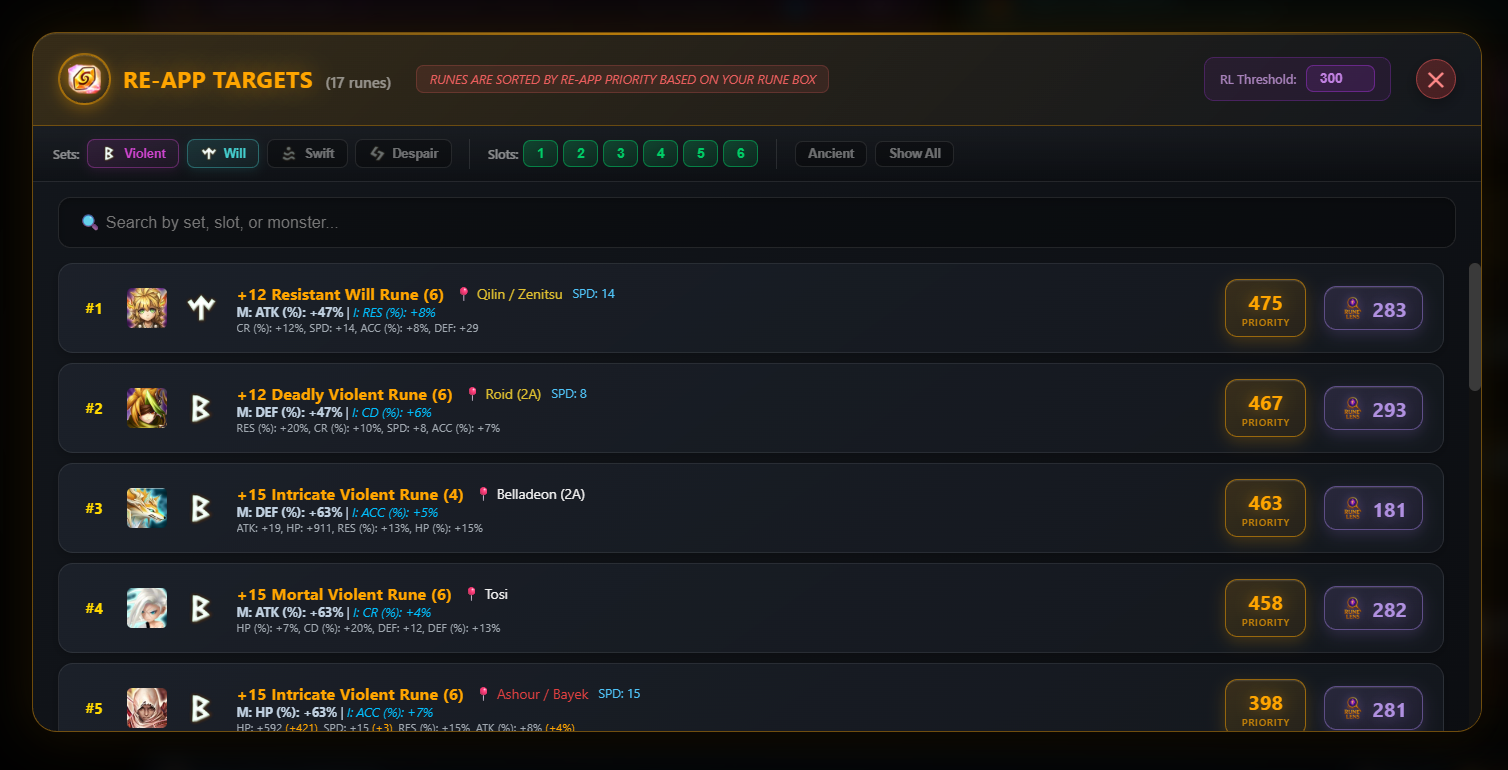 Deep analysis of your entire rune inventory powered by proprietary scoring algorithms. Know exactly where to farm, which runes to keep, and how your account compares to competitive benchmarks.
