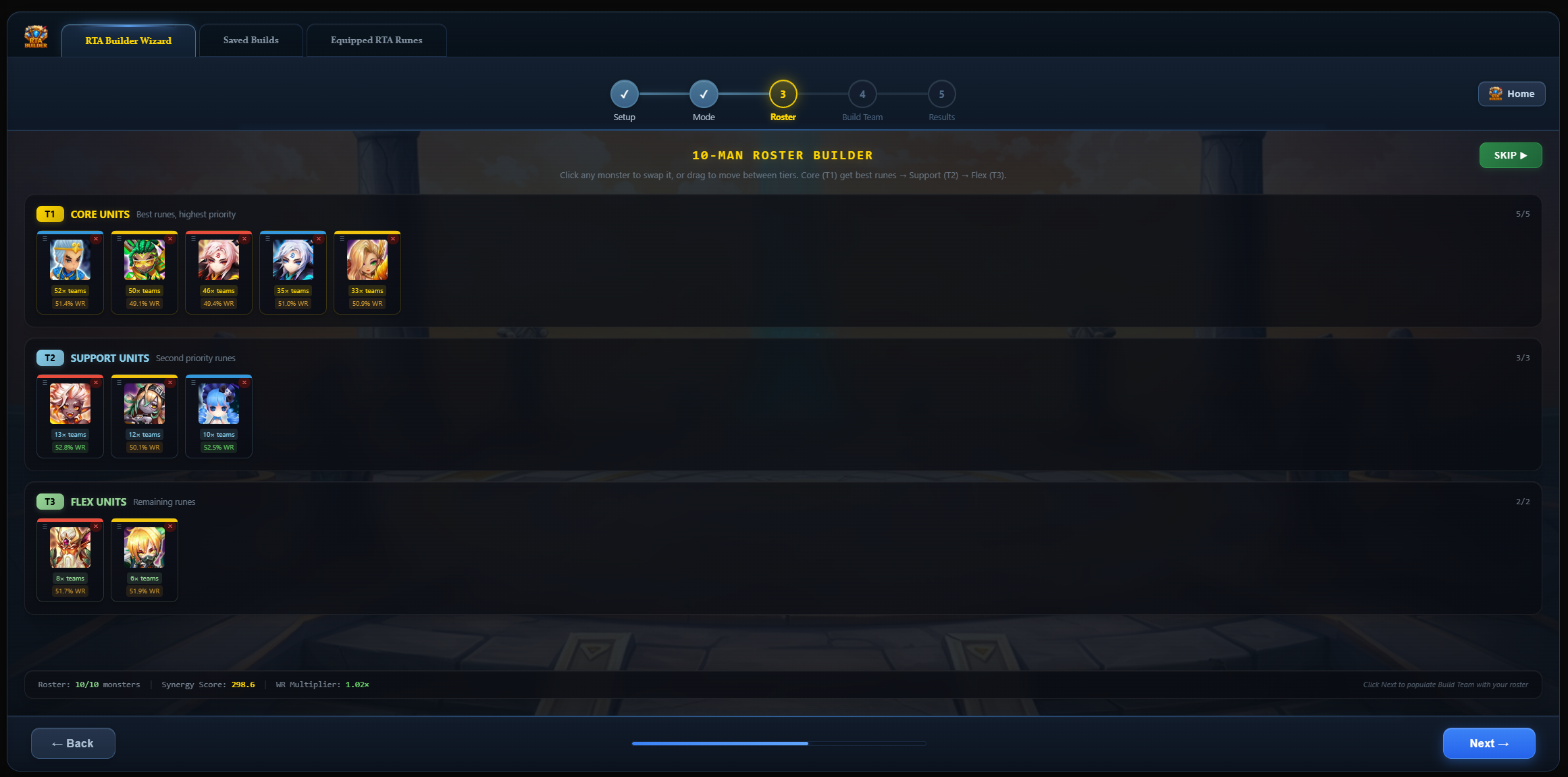 Build optimized RTA teams with data-driven optimization. Import your SWEX JSON and let the wizard process hundreds of millions of permutations within seconds to find the best rune assignments for your entire team with perfect speed tuning.