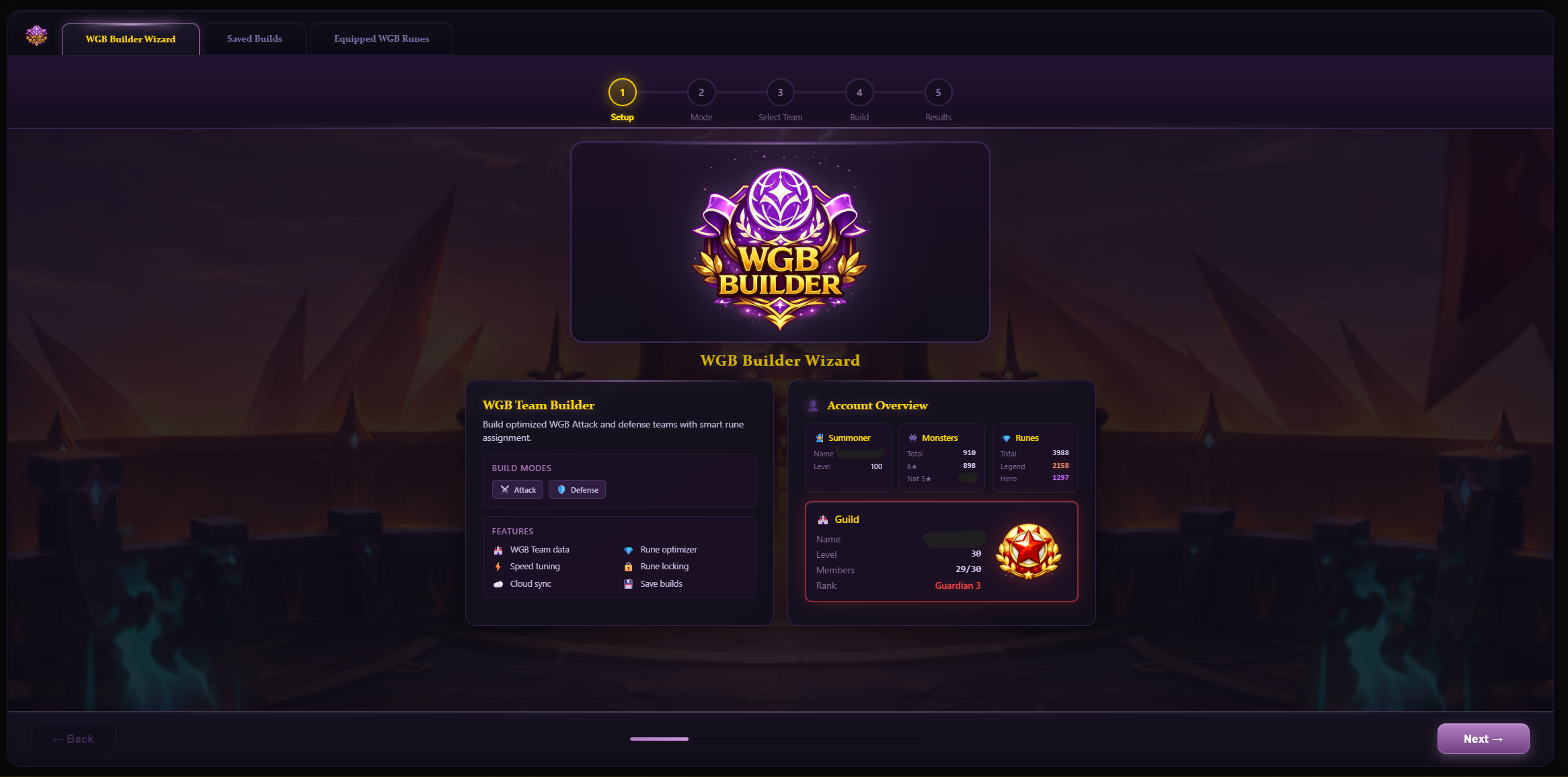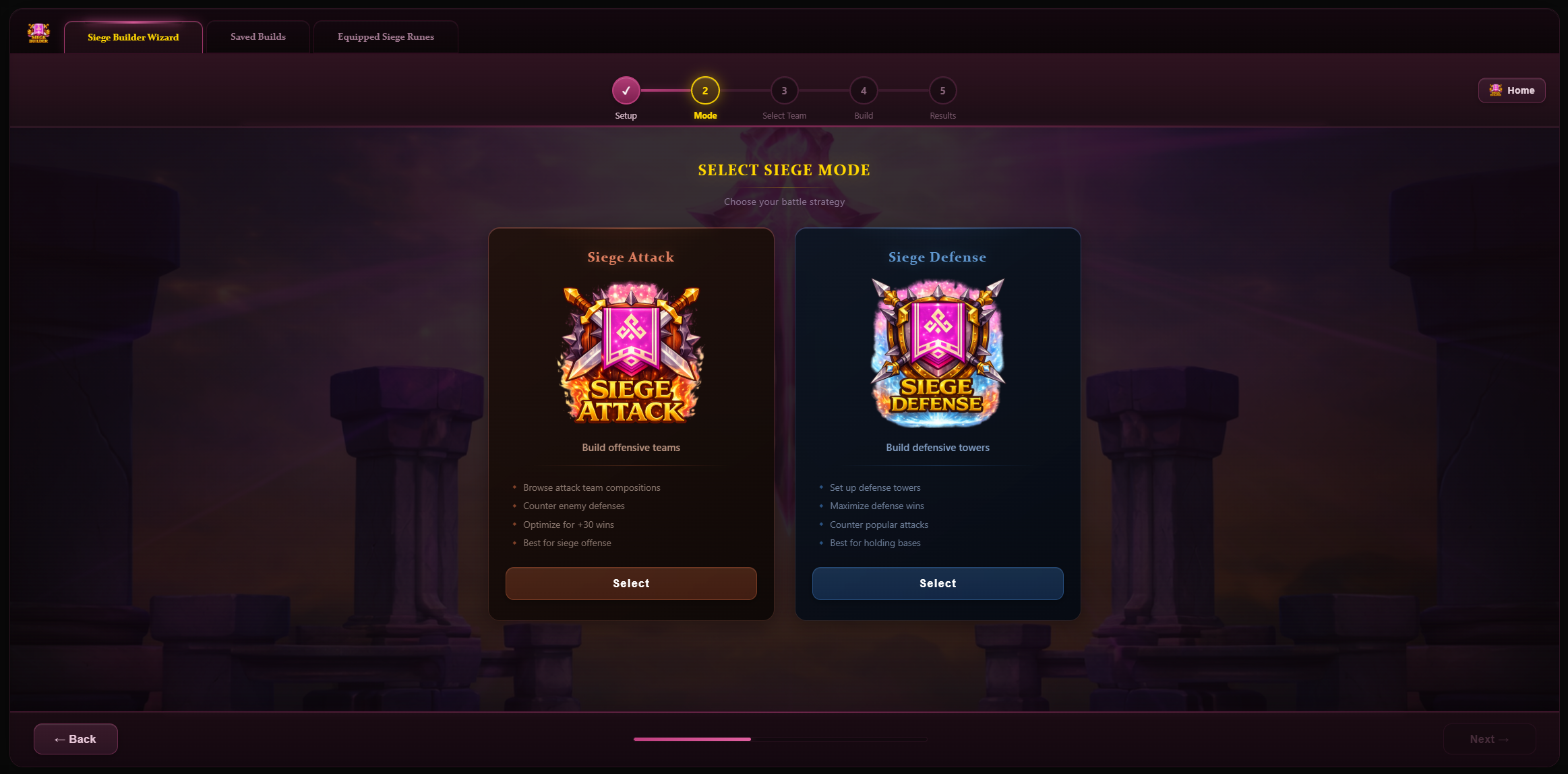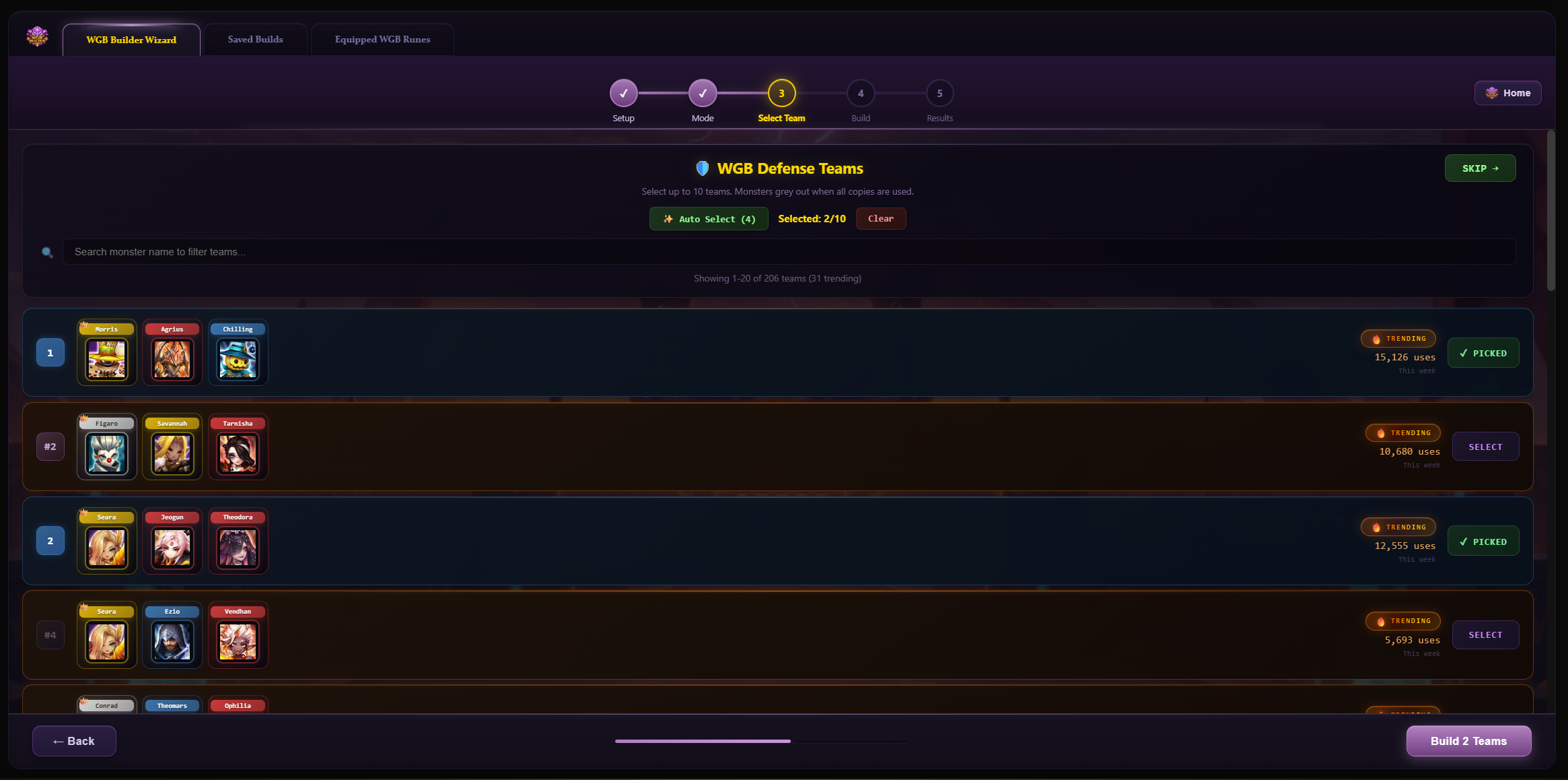 Build optimized siege defense and attack teams using community meta data. Select from popular team compositions, configure build modes, and let the system find the best rune assignments.